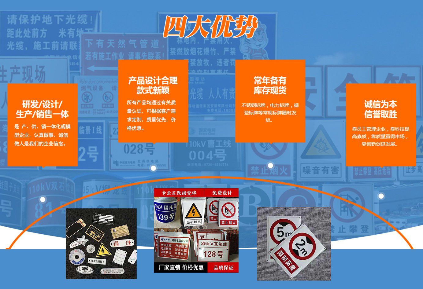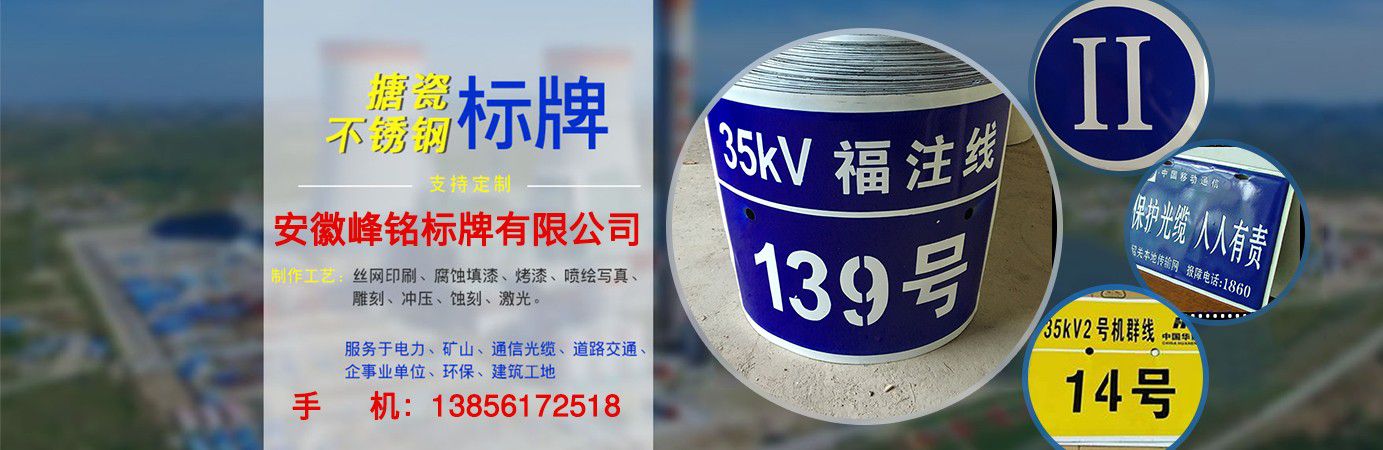 安徽峰銘標牌有限公司成立于2018年,2020年成立峰銘標牌山東分公司,是致力于標牌生產研發的專業企業。峰銘標牌多年來一直專注于標牌及印刷事業,擁有完善的生產技術和先進的生產設備,有多名金屬科研單位和標牌專業、標牌企業從業經歷人才,是專注于標牌標識及印刷品生產的專業型企業。 公司主要產品:腐蝕標牌,搪瓷標牌,絲印標牌,UV標牌,反光標牌,不銹鋼標牌,鋁合金標牌,PVC標牌,亞克力標牌,高光標牌,堆金標牌,烤漆標牌,電力標牌,電廠標牌,電網標牌,通信標牌,安全警示牌,相序牌,塔號牌,桿號牌,刀閘牌,閥門牌,銘牌,面板牌。交通標牌,交通標志牌,高速路標牌,道路標牌,路名牌,限速牌,限高牌,三維立體軟標,熱轉印標牌。地產標牌,鋼廠標牌,宣傳欄,精神堡壘,不銹鋼扎帶,廣告字,水晶字,沖孔字,彩頁畫冊、不干膠印刷等專業生產。 近年來,我公司堅持“科技興廠”的方針,引進先進的生產設備和技術,嚴格執行國家及行業標準,專注同行加工業務,與時俱進,打造出了一系列精美產品。我公司已通過ISO9001質量管理體系認證,我們將繼續貫徹“誠信經營、保質保量、交貨迅速”的方針為您提供更優質的服務?! ∧壳拔宜竞蛧鴥容^多大中型電廠、電力公司、鋼鐵企業、通信企業、車輛企業、公路交通、機電設備、廣告公司同行加工等形成了...